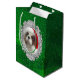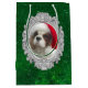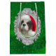 This is a medium Gift Bag featuring an original photograph of a handsome Blenheim Cavalier King Charles spaniel wearing his Santa hat with a green background.