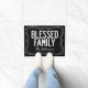 Blessed Family Doormat, words, "blessed" with custom area for family name in white with elegant white decorative frame. Background is black on this design but can be customized to any colour.