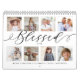 Envoyez un beau cadeau personnalisé à votre famille qu'ils chériront. Calendrier de collage de photos de famille personnalisé pour afficher vos propres photos de famille et souvenirs spéciaux. Le design du capot avant est composé d'un simple 8 collage photo avec le modèle "Blessed" conçu dans un style de script noir manuscrit. Chaque photo est encadrée d'un simple cadre doré. Customisez avec le nom des membres de votre famille. Chaque mois présente une seule image grandeur nature avec le mois écrit en calligraphie noire élégante légèrement affichée sur chaque photo.