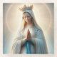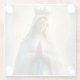 Beautiful Blessed Virgin Mary with gold crown set in a glass coaster. This image of the Virgin Mary has her dressed in white and blue with praying hands, she has a divine halo surrounding her. This coaster can be used for display or give as a gift.