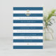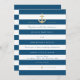 Customisez cet élégant Faire-part de mariage Nautique élégant et moderne. Design rayé bleu foncé et blanc, conçu comme un modèle pour une personnalisation facile. La couleur Bleu foncé des bandes est personnalisable et peut être changée en n'importe quelle autre couleur, vous pouvez la changer en changeant la couleur Arrière - plan. Veuillez noter que l'or sur ce design, sur l'ancre d'or, n'est pas une véritable feuille d'or, c'est une impression couleur. La couleur du texte est personnalisable, les éléments dorés peuvent être déplacés ou supprimés. Vous pouvez également modifier le style d'angle. Vous trouverez ci-dessous des liens vers une carte de réponse RSVP correspondante, une invitation à la douche nuptiale, une invitation à dîner de répétition, des cartes à dater (photo et non photo), des autocollants Merci Favors et des cartes à dos de programme.