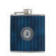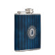 Flacon de type élégant avec des graphiques d'un bleu sur un motif rayé bleu, avec une plaque métallique à l'aspect argenté, sur le devant. Personnalisez le monogramme d'une lettre bleue, dans la plaque ronde, pour vous-même ou comme une excellente idée cadeau pour n'importe quel type et surtout comme un cadeau de mariage pour les groomsmen.