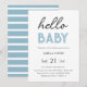 Baby shower simple et moderne, sur mesure, invitation, en bleu et blanc. Avec les mots "bonjour bébé" et rayé bleu et blanc inverse.