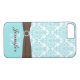 Ce coque moderne, personnalisé, aqua bleu et blanc damassé iPhone 7 avec un brun chocolat ruban et broche de bijoux IMPRIMÉ a une place pour vous d'ajouter votre nom et monogramme.