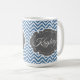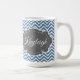 Profitez de votre café ou thé avec une tasse de café personnalisée Blue Chevron. Le design de la tasse à café comprend un arrière - plan de chevron bleu et une étiquette grise ornée pour personnaliser avec votre nom et monogramme. Autres articles disponibles avec cette conception aussi. Contactez-moi directement pour obtenir de l'aide sur la personnalisation.