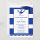 Invitation à la remise de diplômes en bleu et blanc de la Marine avec un design nautique minimaliste avec ancre et casquette de graduation.