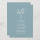 Aidez vos invités à trouver leur table avec cette élégante carte moderne de plan de salon avec les noms des invités. Cartes recto-verso pour que les clients puissent chercher leur nom à l'avant ou à l'arrière. Libérez de l'espace tout autour en vous donnant la liberté d'utiliser des clips ou un trou de perforation pour accrocher des écrans, ou d'utiliser le support/cadre de table. Arrière - plan bleu poudre et texte blanc. Détails de calligraphie manuscrite moderne. Plusieurs options de couleur. Ayez tous les numéros de table dans la même couleur ou mélangez les couleurs selon le thème de couleur de votre événement.