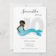 Invitation d’anniversaire d’un enfant de sirène avec une sirène à la peau brune et aux cheveux noirs en tenue bleue. Elle est assise devant l'âge (qui peut être changé). Customisez simplement cette invitation, ajoutez-la à votre panier et profitez de cet anniversaire de sirène ! Blue Kids Mermaid Anniversaire Invitation Jours fériés Conception | ©Melissa Patton - Artiste/Illustrateur