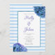 Joli design de fleurs d'hydrangée bleue avec rayures bleues et blanches. Les invitations et les cartes sont disponibles dans une sélection d'options de forme (arêtes arrondies, échalotes, etc.) et dans un choix de textures de papier. Les styles de police, les couleurs et la taille sont personnalisables. Vous pouvez trouver d'autres conceptions avec de nombreux produits de coordination dans notre magasin, y compris des invitations, enregistrer la date et les cartes rsvp, étiquettes de remerciement, et plus encore.