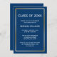 Annoncez votre graduation en style avec cette invitation classique de graduation bleu marine et or. Parfait pour un baccalauréat, un diplôme d'études supérieures ou une fête de fin d'études supérieures ! Les dessins sont des illustrations/graphiques à papier plat - PAS VRAIMENT GOLD FOIL.