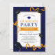 Cette invitation à la fête de remise de diplômes comprend des casquettes bleus noirs de graduation avec des tasselles et des rubans orange, et un arrière - plan bleu détaillé. Personnalisez votre propre image et texte.