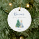 Blue Bunny Rabbit Premier Noël Personnalisé Nom Rond Ornement en céramique — Le précieux modèle personnalisé en ornement de Noël dispose d'un adorable lapin aquarelle, debout à côté d'un arbre de Noël festif avec de jolis cadeaux emballés. Les zones de texte permettent de personnaliser facilement le nom d'un bébé dans une police manuscrite de script de calligraphie, et l'année de naissance dans une simple et minimaliste sans serif. Les deux côtés de cette décoration personnalisée, neutre pour le genre, d'arbre de conservation sont identiques.