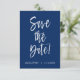 Bleu et blanc marine Script lettré Enregistrer la carte de date. Le texte de ce script de brosse manuscrit peut être mis à jour et customisé avec le nom et la date.