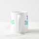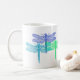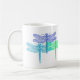 Des libellules dans les tons bleu et vert entourent la tasse de café.