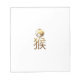 Idéogramme simple et large du singe avec illustration de singe en haut en couleur dégradé "doré" et effet numérique en relief sur l'arrière - plan transparent. Conception sur bloc-notes carré avec arrière - plan blanc. Vous pouvez facilement modifier la couleur de l'arrière - plan en cliquant sur le bouton personnaliser. Carte de voeux, produits artisanaux, produits de la maison, vêtements, accessoires et plus encore... Parfait pour le Nouvel An Chinois du Singe ou Anniversaire (personnes nées dans l'Année du Singe) —"Le Singe (猴) est le neuvième du cycle de 12 ans d'animaux qui apparaissent dans le zodiaque chinois lié au calendrier chinois. L'année du singe est associée au symbole 申 de la branche terrestre. " - Wikipedia 8 février 2016 - 27 janvier 2017 : Singe-feu On peut dire que les personnes nées dans ces plages de dates sont nées dans l'année du singe, tout en portant son signe élémentaire de gouvernance= 2 février 1908 - 21 janvier 1909 Terre : Singe, 20 février 1920 - 7 février 1921 : Singe métallique, 6 février 1932 - 25 janvier 1933 : Singe hydrique, 25 janvier 1944 - 12 février 1945 : Singe des bois, 12 février 1956 - 3 janvier 1957 : Singe de la Terre, 30 janvier 1968 - 16 février 1969 : Singe de la Terre, 16 février 1980 - 4 février 1981 : Singe du Métal, 4 février 1992 - 22 janvier 1993 : Singe de l'eau, 20 janvier 04 - 8 février 2005 : Singe des bois, 8 février 2016 - 27 janvier 2017 : Singe des feux, 26 janvier 2028 - 12 février 2029 : Singe de la terre," (WIKIPEDIA)
