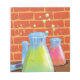 Équipement en verre de dessin animé sur un banc, collection d'objets scientifiques expérimentaux en verre assis sur un banc en bois devant un mur en brique.