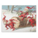 Funny vintage Christmas illustration of little white bearded gnomes dressed like Santa, portging a cut tree trunk through the snow. Published by L. Prang & Co.