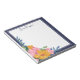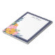 Beautiful floral notepad with a striking floral arrangement hand-drawn on a tablet in pink and yellow with greenery in green and blue. The cluster of flowers sits in the bottom corner of the personalized notepad, leaving plenty of room to write down notes, reminders, to do lists and more. Personalize with your name at the top in a navy blue script.
