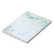 A single blue butterfly on a pale pasta blue and green watercolor background with a floral fringe with a single pink flower.