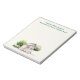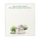 Bloc-notes avec dessin de poulailler le long du bas de chaque feuille. Ajoutez du texte en haut, si vous le souhaitez. Fond beige, avec petit poulailler, poulet et arbres dessinés le long du bas. Le texte est entièrement en majuscules et en vert foncé. Utilisez pour personnaliser avec un nom et une adresse, ou un nom d'entreprise.