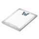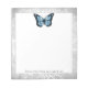 Ajoutez des notes et des rappels avec un Bloc-notes Bleu brillant personnalisé. Le design du Bloc-notes comprend un papillon brillant orné d'une vigne de feuillage contre un arrière - plan gris grunge et de l'espace à personnaliser avec votre nom. Autres articles de papeterie correspondants disponibles avec cette conception aussi. Si vous avez besoin d'aide pour la personnalisation, veuillez me contacter directement.