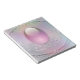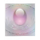 Un décor bleu pastel, lavande et rose avec un oeuf rose translucide dans un cadre argenté, entouré d'un cadre ovale argenté clair et composé de quatre pierres précieuses plus lisses comme des oeufs colorés.
