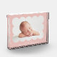 Bloc photo simple et moderne avec la photo de votre bébé niché à l'intérieur d'un cadre rose vermillon. Personnalisez le bloc photo en ajoutant le nom de votre bébé et des informations supplémentaires en lettres blanches.