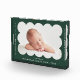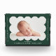 Bloc photo simple et moderne avec la photo de votre bébé niché à l'intérieur d'un cadre vert de la forêt. Personnalisez le bloc photo en ajoutant le nom de votre bébé et des informations supplémentaires en lettres blanches.