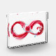 Infinity symbole of continuous stream of red pouring into glass glass glass on white background.