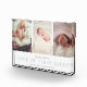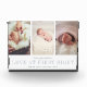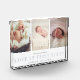 Un bloc photo pour bébé simple et moderne comprend trois de vos photos préférées de nouveau-nés alignées côte à côte, avec un bandeau blanc sur le bas de la page lisant "l'amour au premier regard" en gris clair, flanqué du nom et des statistiques de naissance de votre petit. Un design moderne et minimaliste neutre pour les femmes qui fait un cadeau parfait pour les nouveaux parents.