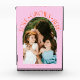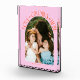Modern and minimal family memory photo block featuring a photo in a arch frame with a text that says "Love Grows Here" with tiny hearts. Orange and pink.