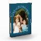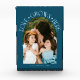 Modern and minimal family memory photo block featuring a photo in a arch frame with a text that says "Love Grows Here" with tiny hearts. Teal.