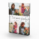 Modern and whimsical family memory photo block featuring 4 photos of the family with a hand written script that says "Love makes a family" with tiny hearts. White.
