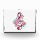 Pink treble clef with delicate, detailed pink Japanese cherry blossoms against white background painted over with light blue paint Blooming pink sakura.