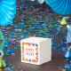 Colourful houses birthday party theme featuring text at centre with colourful houses neighbourhood square border on front.