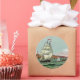 This antique image shows an elegant ship at full sail leaving the harbour. The colourful sky of blue and orange is a soothing compliment to the blue green water. It is ready for your personalization.