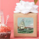 This antique image shows an elegant ship at full sail leaving the harbour. The colourful sky of blue and orange is a soothing compliment to the blue green water. It is ready for your personalization.