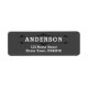 A traditional personalized design featuring classic slab serif name and return address text with retro ornamental decoration on a slate grey background.