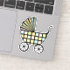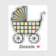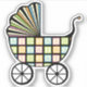 Promenez-vous avec ce joli pram stylisé décoré de rayures rose, orange, verte et bleue sur la couverture et d'un motif rappelant les blocs de bois sur le corps.