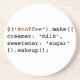 Mmmm... Enjoy some delicious JavaScript Coffee. Milk and Sugar Please. $('#coffee').make({ creamer: 'milk', sweetener: 'sugar' }).wakeup();