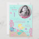 Little mermaid first birthday invitation card with underwater creatures.
