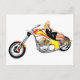 A beautiful blonde in a leather dress lying on a chopper motorbike.