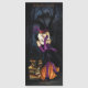 A blonde witch sitting on a large orange pumpkin. At her side is a black cat sitting on a pile of books. In behind is a forest and a castle