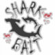 Surf style shark bait stickers with a black silhouette of a Hammerhead Shark swimming in the ocean, circling looking for food, with red splashes of blood in the water.