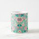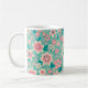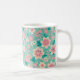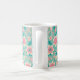 This mug features a delightful design of pink flowers in full bloom against a crisp blue background. It's a charming way to start your day or enjoy a relaxing cup of tea.