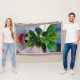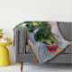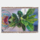 This Throw Blanket features an original photograph by ZoeSPEAK of a croton plant viewed from above, with its beautiful green and yellow striped leaves surrounding the blooms. Below sits it’s red pot, resting on a colourful mosaic table, in tropical shades of aqua blue, orange, lime green and red.