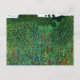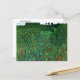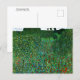 A fine art postcard featuring a painting by the Austrian artist Gustav Klimt (1862-1918) from 1907, Blooming Poppy Field (Blühender Mohn Mohnwiese). A striking landscape with red and blue flowers, fruit trees, and green shrubs.