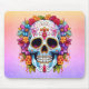 a vibrant and captivating artwork that blends the elegance of floral motifs with the bold symbolism of a sugar skull. Inspired by the traditions of Día de los Muertos, this design features an intricately decorated skull surrounded by a vivid bouquet of colorful flowers. Set against a radiant gradient background.