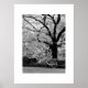 A black and white photograph of a bicycle parked in front of a large cherry tree in blossom on a street in Tokyo, Japan.