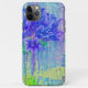 This phone case flaunts a digital collage made up of several layers of scans of photographs, paintings and textures. A cluster of blue violet flowers sits on an abstract background in shades of lavender, green, purple and shades of blue.